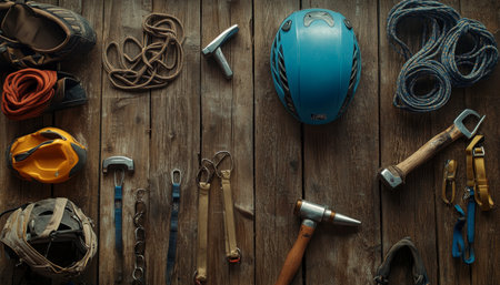Climbing gear display helmet, hammer, carabiner, trekking shoes on rustic wooden surface