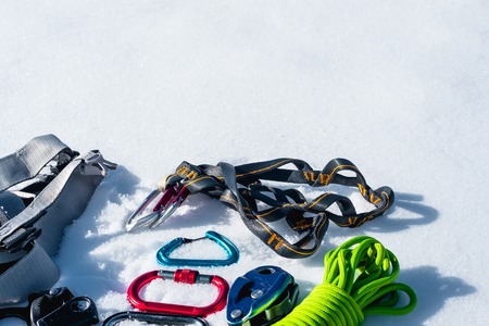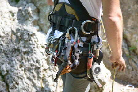 Climbing equipment (rack gear, hardware) needed for belaying in the mountains and rocks.