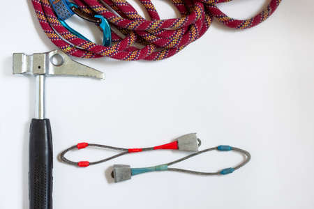 Flatley on a white background is a rock hammer, rope, embedded elements, carbines