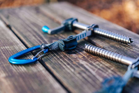 Two ice screws laying on a wooden surface. Ice climbing tools or equipment on a wooden floor. Carabiners, slings and other climbing gear.