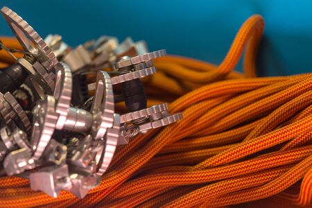 climbing equipment folded on an orange rope. modern equipment for climbing in the mountains. adventure on the rocks.