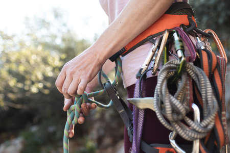 Close-up of climber with climbing equipment, tying knot on climbing harness, preparing for climbing.