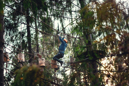 well equipped teenage boy in outdoor passing obstacle course. Active recreation in high rope park