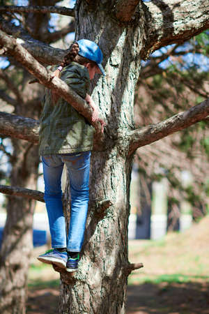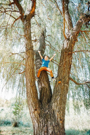 Little boy climbing a tree on a summer day in the park.