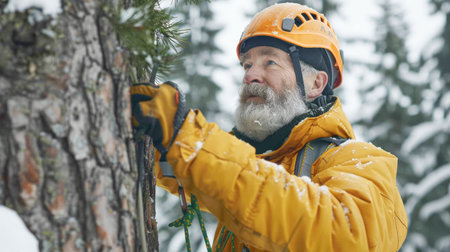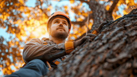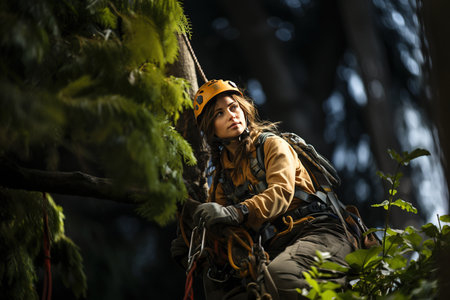 graceful arborist, skillfully ascending a rope to prune and cut for big trees in action expertise in tree maintenance.Generated with AI