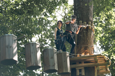 A man and a woman is walking across a challenging ropes course in the extreme park
