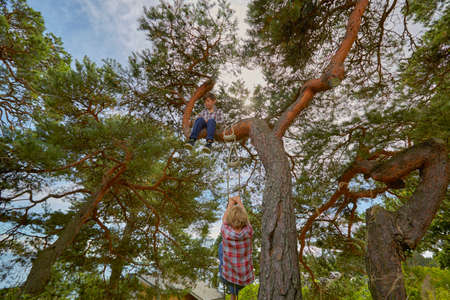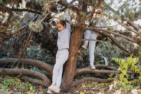 Two kids in the autumn pine forest climbing up tree trunk. Kids games, leisure recreation lifestyle. Summer holiday adventure. Achievement. Happy family, childhood. Healthy active lifestyle.