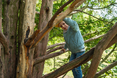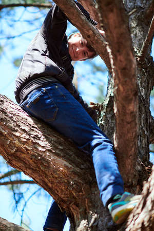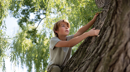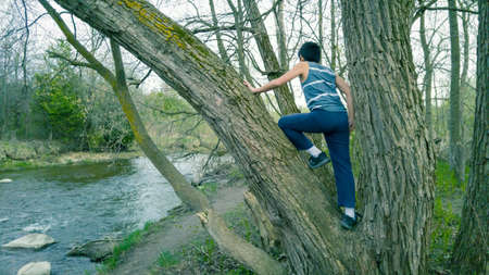 Teenage boy playing outdoor, climbing a tree, bright sunlight, beautiful day