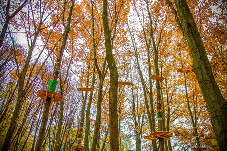 Rope Park in the fall.Recreation, entertainment. Climbing rides, zipline, rope snowboard. playing sports in nature.