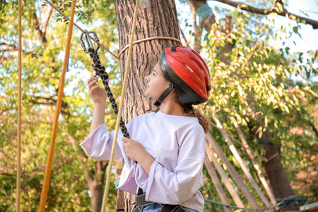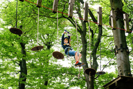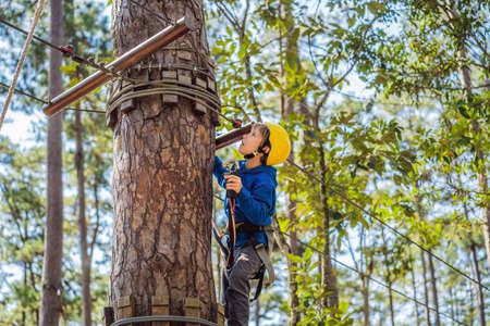 Child in forest adventure park. Kid boy in helmet climbs on high rope trail. Agility skills and climbing outdoor amusement center for children. Outdoors activity for kids and families.