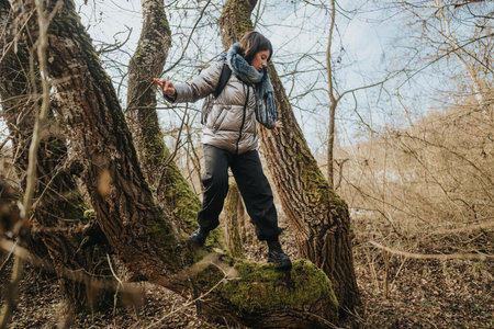Young individual climbing a moss-covered tree in a winter forest setting to explore nature