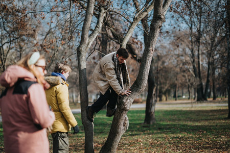 Kids climbing trees, hanging upside down on a tree in a park. Child protection.