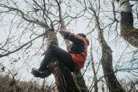 Person Exploring the Outdoors by Climbing a Tree in a Forested Area
