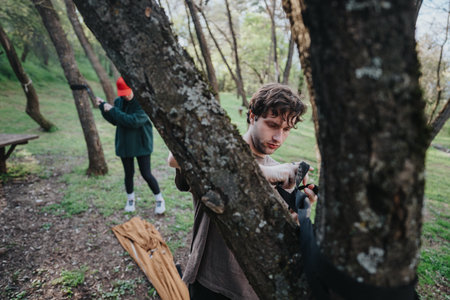 Young adults enjoying outdoor activities in an autumn park setting