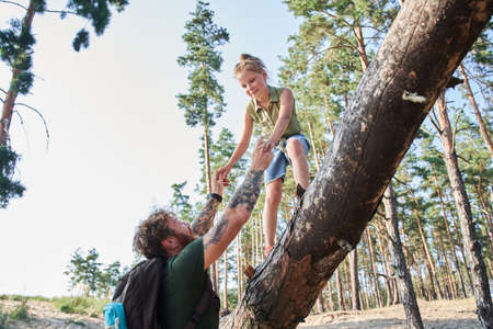 Man helping his daughter get down from fallen tree