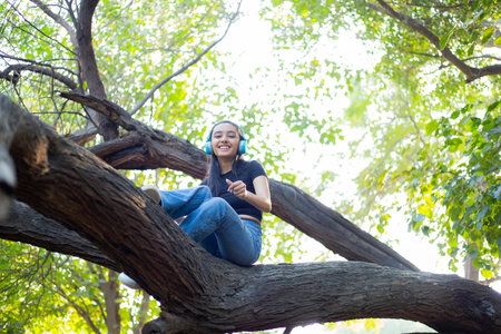 Young woman listening to music with headphones sitting on a tree in the park