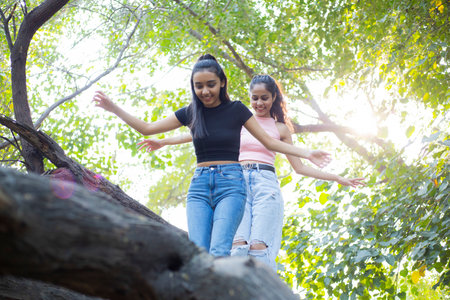 Two young women having fun on the tree in the park. Outdoor lifestyle portrait.