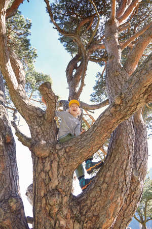 Outdoors portrait of cute preschool boy climbing a tree.