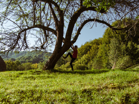 Fit girl training outdoors, climbing tree, showcasing flexibility and strength. Active lifestyle in a green park.