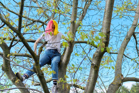 Teenager girl, hipster sitting high on a tree. Spring, nature sky background. Adolescence, character, lifestyle, behavior of adolescents