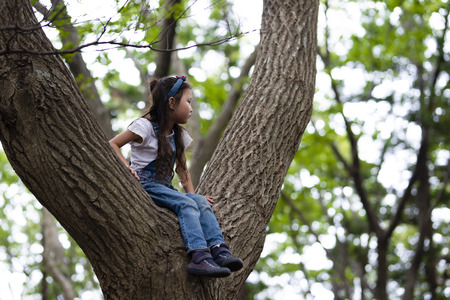 little girl with plaits is climbing on a tree