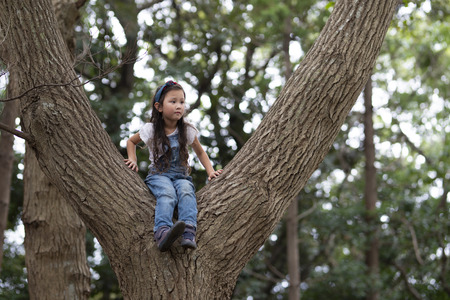 Young girl climbing a tree while looking at the camera