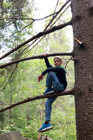 Boy sitting on pine branch in forest, Karelia
