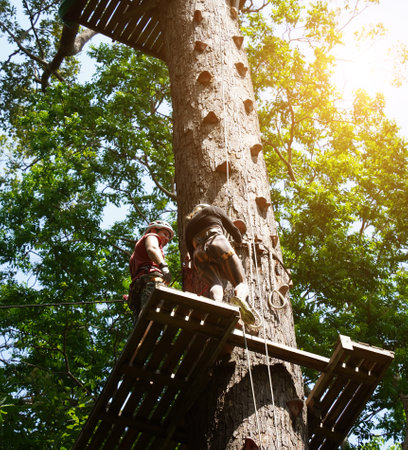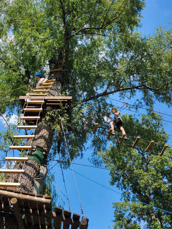 View of high ropes course, process of climbing in amusement activity rope park. happy children climbing. ai generated