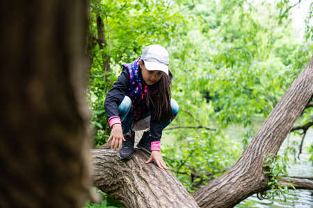 Young happy fearless woman climbing on a big pine tree in the forest. Tree climbing, emotions, happy positive concept