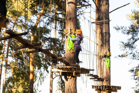 Little girl is standing on a rope, holding a rope with his hands. A child in a rope park passes obstacles