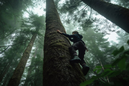 Child climbing a mossy tree trunk in a mysterious, foggy forest, enjoying outdoor activities and exploring nature
