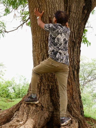 Village man climbing on tree, people lifestyle at nature field.