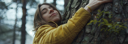 Caucasian woman hugging the trunk of a big tree in the forest.
