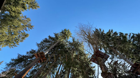 View of high ropes course, process of climbing in amusement activity rope park. ai generated