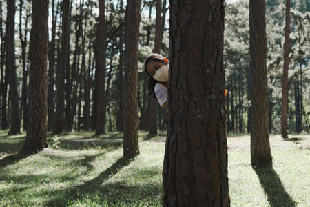 Smiling woman in mask peeking out from behind tree in a park. Happy woman hiding behind a tree in a summer day. Love nature concept.