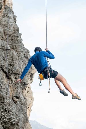 young strong man rock climber climbing on a high vertical limestone cliff, reaching holds, making hard wide move and gripping hold, attaching rope. Conquering, overcoming and active lifestyle concept.