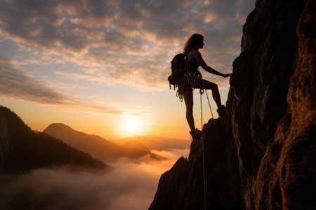 An AI generated illustration of A man is scaling the side of a rugged cliff face at sunset, his body silhouetted against the warm, orange sky