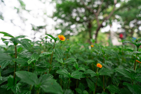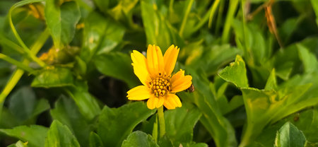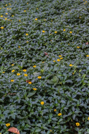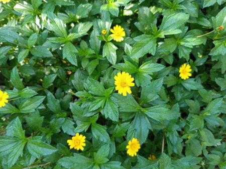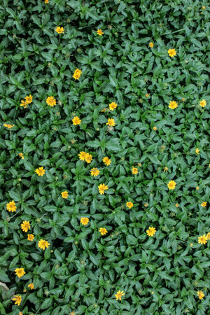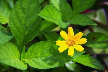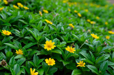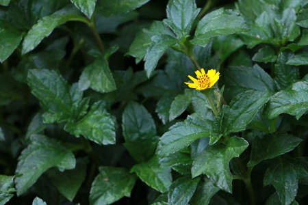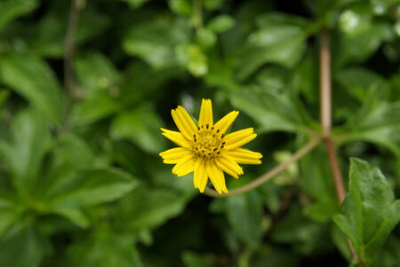 Little yellow Singapore daisy with green lush leaves background - top view flower shot