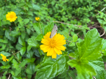 butterfly on yellow flower with green leaf in nature garden.