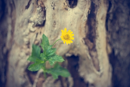 yellow flower growing on dead tree, soft focus, vintage color tone
