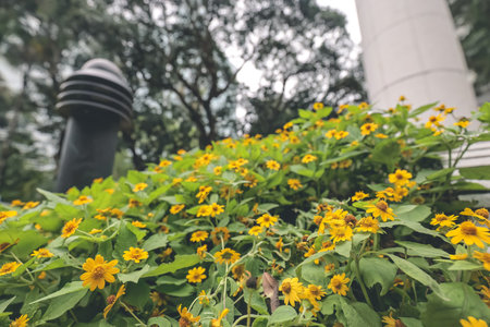 Small yellow flowers on garden as landscape design elements.