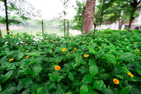 Yellow Flowers Growing Among Green Leaves in a Rainy Park Landscape