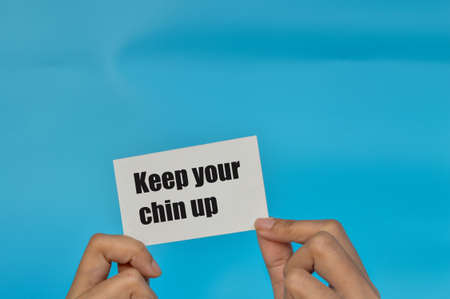 Hand holding white card written with phrase KEEP YOUR CHIN UP