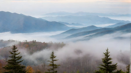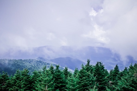 smoky mountains tree tops in dense fog.