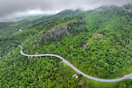 Winding mountain road in summer woods. Linn Cove Viaduct in Appalachian mountains in North Carolina with fresh green forest trees in summertime season. Beauty of USA nature