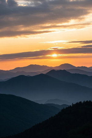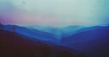 Serene Sunset Over Blue Ridge Mountains with Layers of Shadows, Vibrant Colors and Distant Peaks