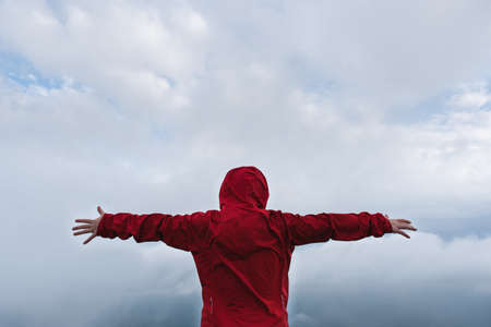 Back view of a kid with extended arms in front of a dramatic sky and wearing a colorful red raincoat. Feeling free and flying sensation concept.