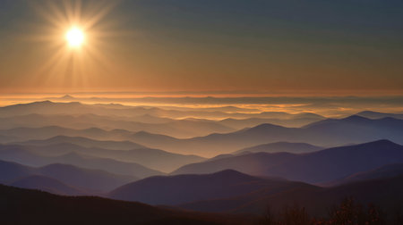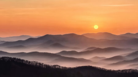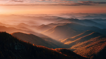 A breathtaking view of rolling mountains bathed in the warm glow of a sunset, with gentle haze creating layers of depth and tranquility in the landscape.