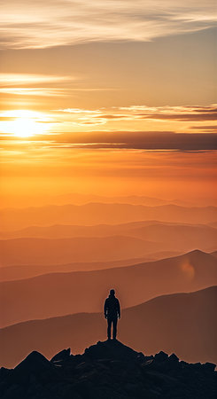 A lone figure stands atop a rocky summit, gazing at a breathtaking sunset painting the sky in vibrant oranges and yellows, with layered mountain ranges receding into the distance.