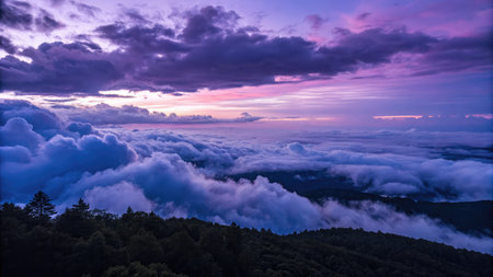 A striking view reveals a thick blanket of clouds covering the mountains below at sunset. Shades of purple and pink fill the sky, creating a breathtaking natural display over the horizon.